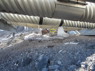 The photo below may show a leak in an above ground heat traced fire protection line (located in an extreme cold environment):