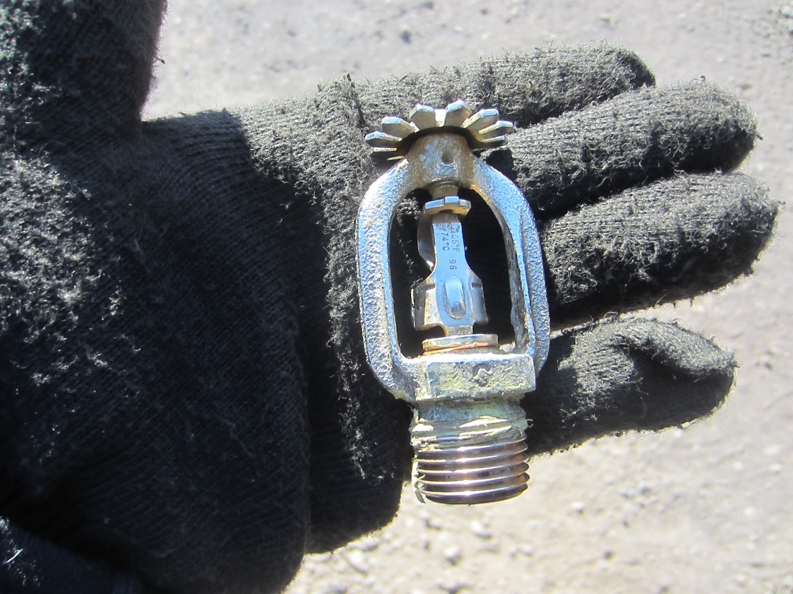 Below a series of photographs show a 1/2" fire sprinkler head removed from a double interlock pre-action system. There is some evidence to such (unquantified amounts) debris was in the system. Debris is mechanically "knocked out" of head on bumper of service vehicle: